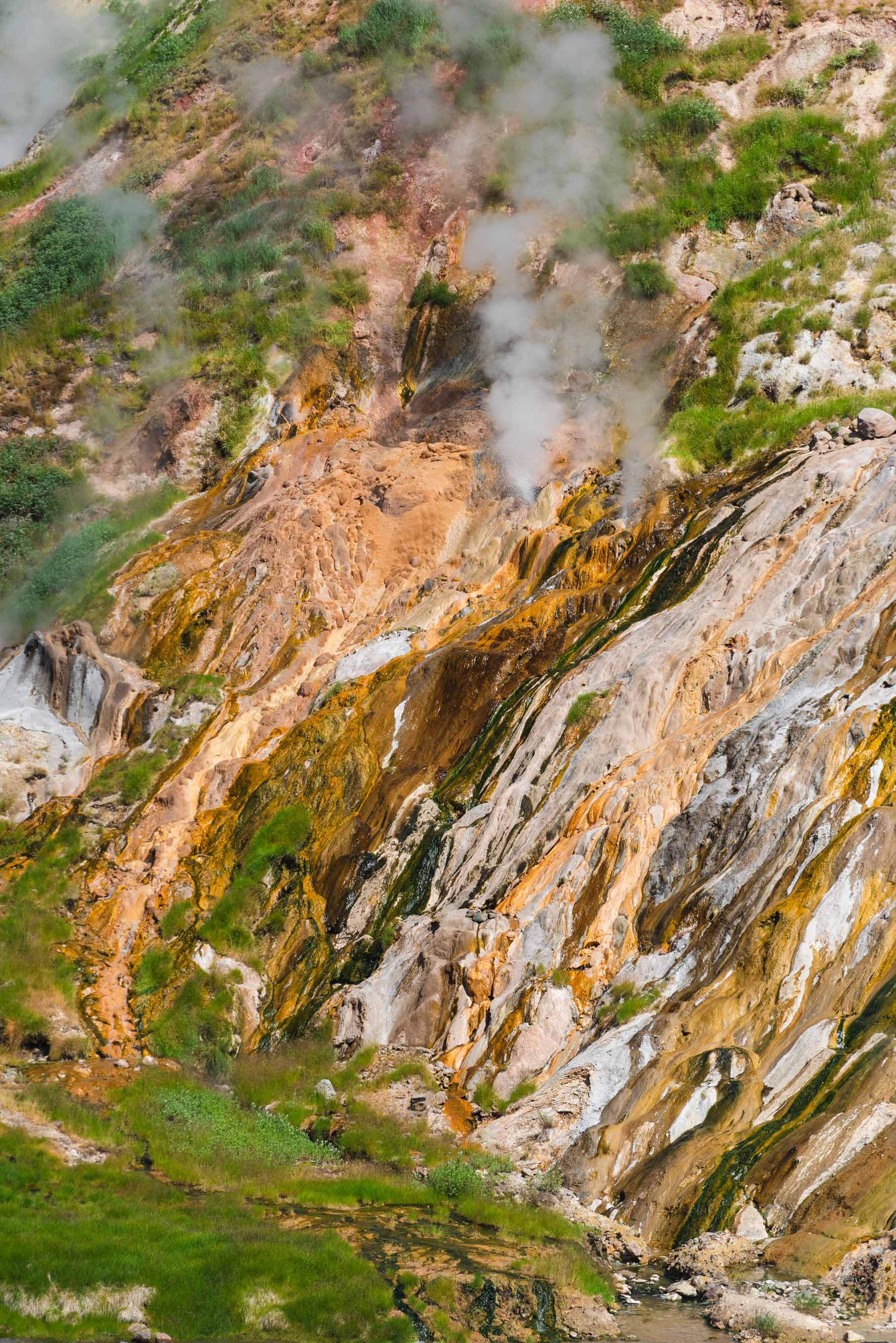 В 11 утра прибываем в Долину гейзеров. Гуляем среди кипящих источников, вулканчиков, грязевых котлов и паровых струй. Жемчужина Долины — гейзер Большой. Его фонтан может достигать 12 м, а смотровая площадка расположена так близко, что вы оказываетесь внутри парового облака. Еще один удивительный природный объект — гейзерная стенка Витраж.