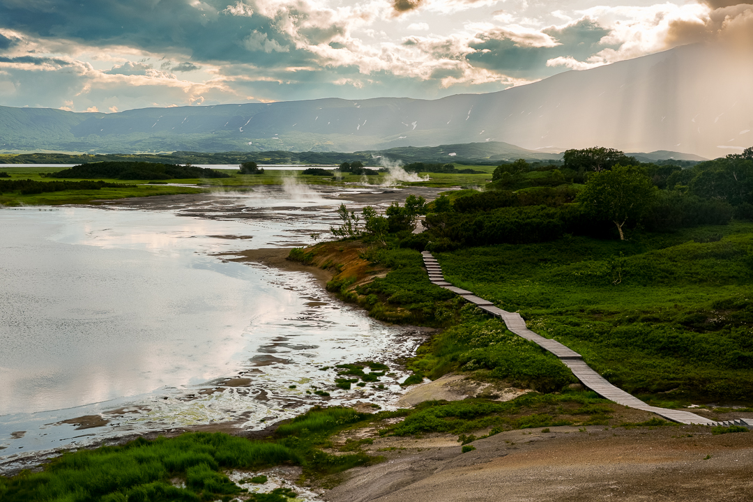 Одно из семи чудес России - Долина гейзеров на Камчатке, достойная соперница исландской сестры. Долина усеяна дикорастущими пряными травами, термальными источниками, грязевыми котлами, водопадами, озерами и, конечно, бурлящими гейзерами. Наиболее крупные из них выбрасывают фонтан кипящей воды на 5 и даже 10 метров в высоту, насыщая воздух характерным запахом сероводорода и паром. Прямо на деревянных дорожках в парке можно увидеть медвежьи следы — самые настоящие.